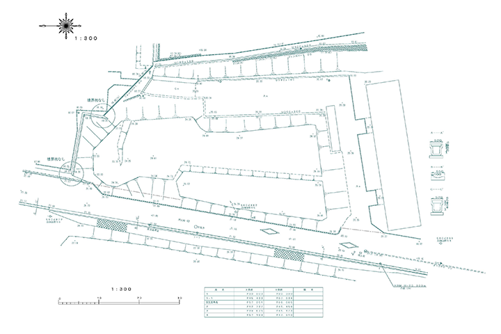 トータルステーションやGNSS測量機を用いて、土地の地形、地物を測定し地形測量図(CAD図面)を作成することを目的に行う測量です。